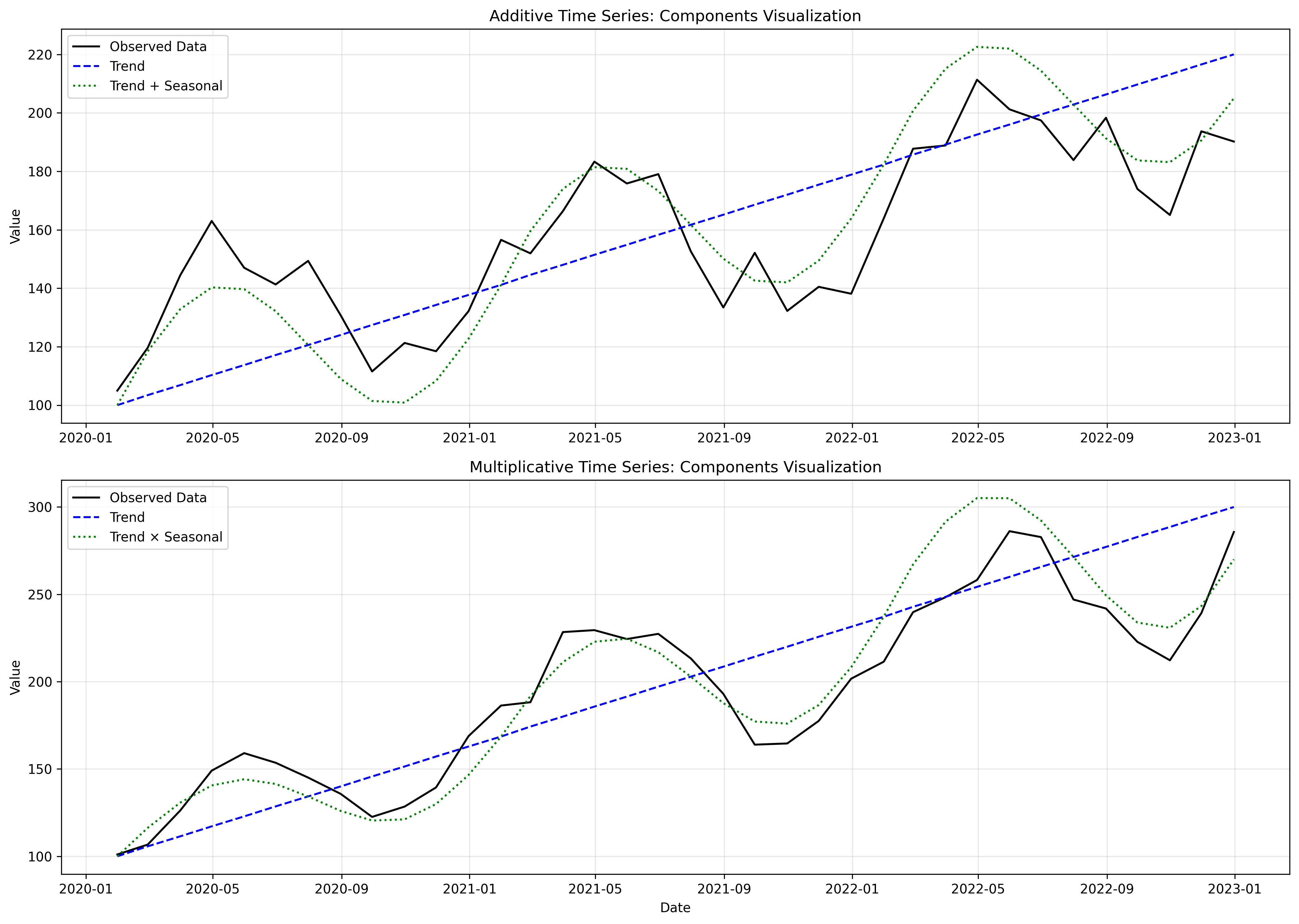 This visualization shows a synthetic time series with trend, seasonality, and random variations. Even in this simplified example, we can observe several key characteristics of time series data: