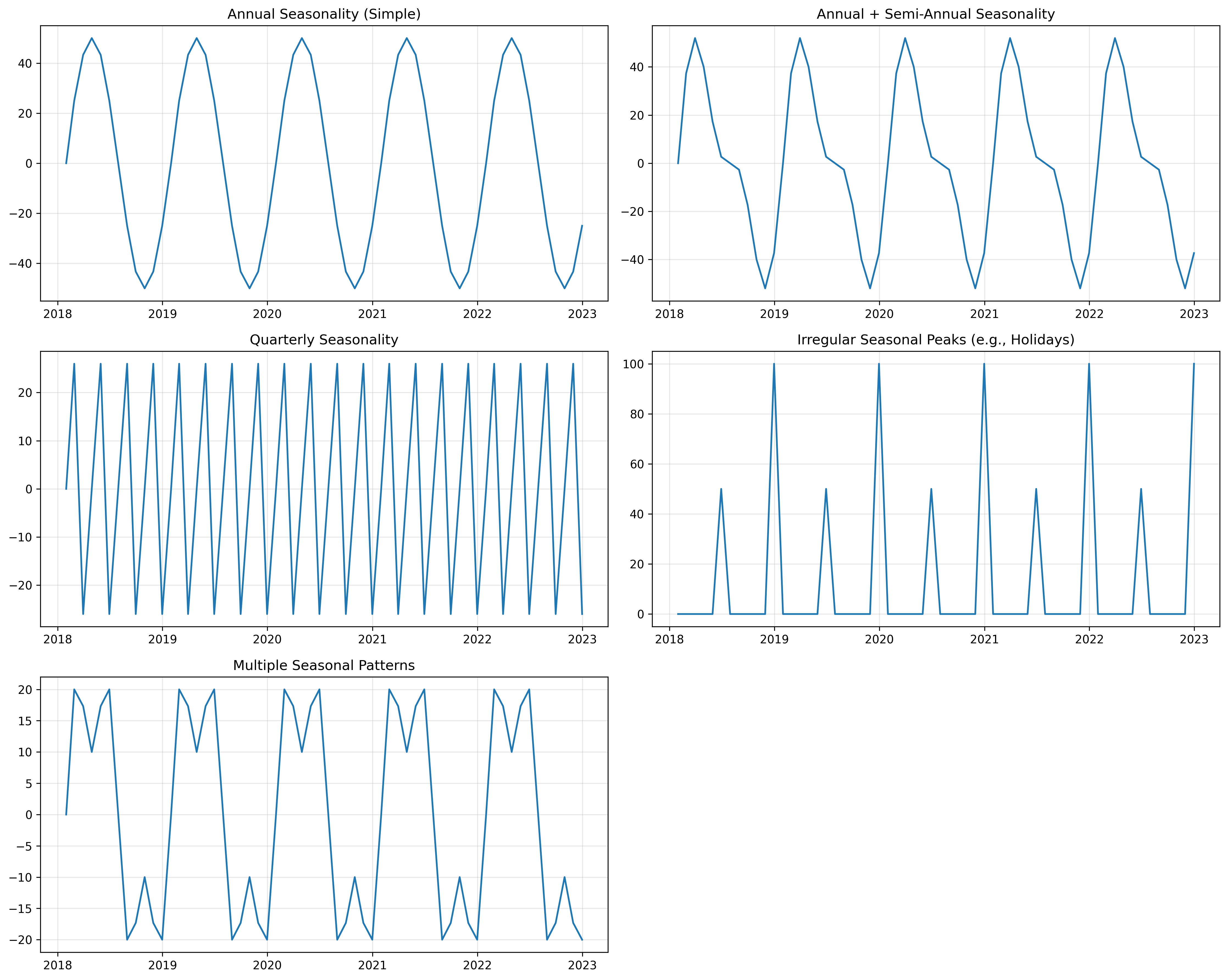 Seasonality refers to repeating patterns that occur at regular intervals. As shown in Figure 3, these patterns can vary widely: