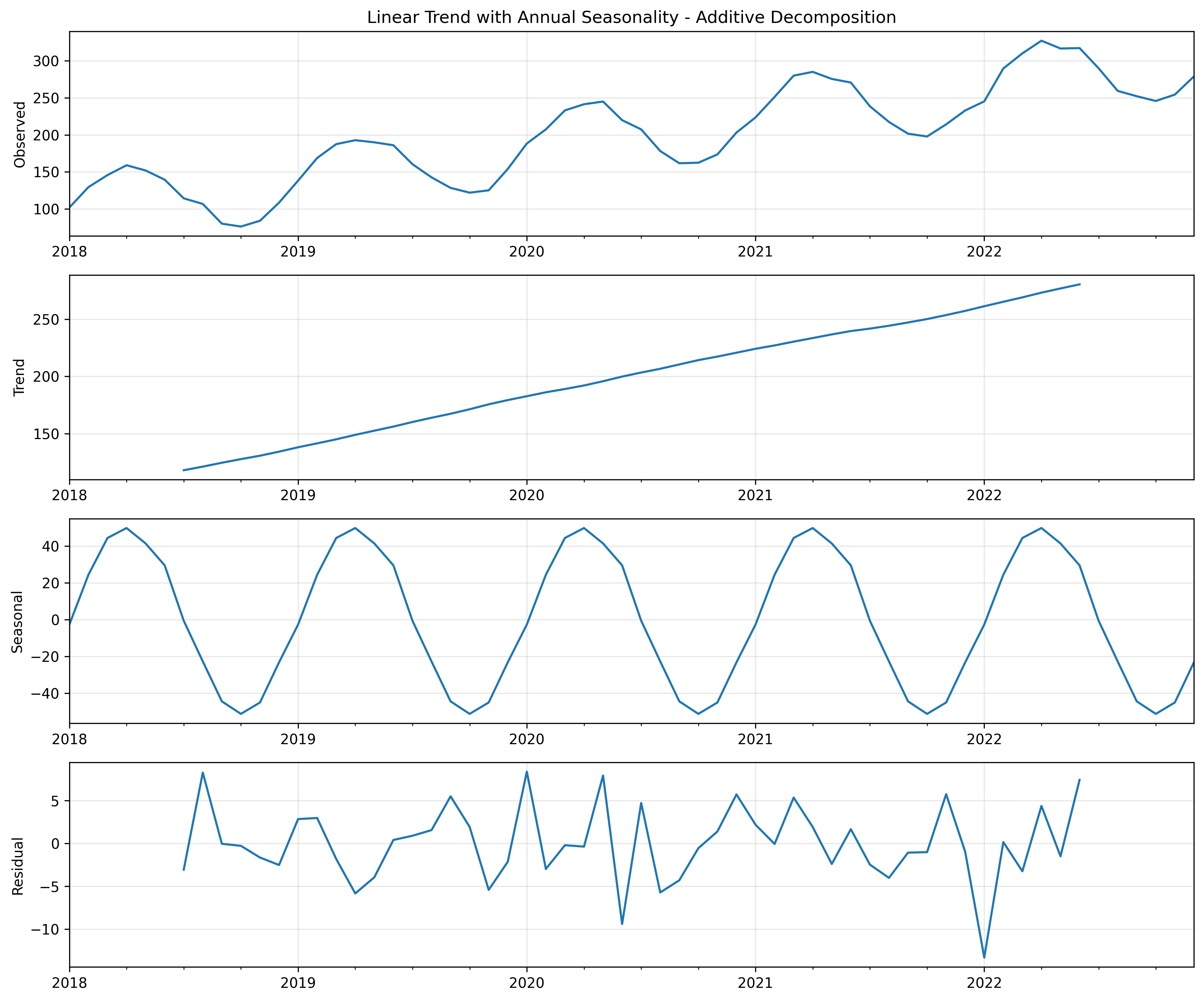 In Figure 5, we can see a time series broken down into its components: - The observed data (top panel) - The extracted trend (second panel) - The seasonal pattern (third panel) - The residual noise (bottom panel)
