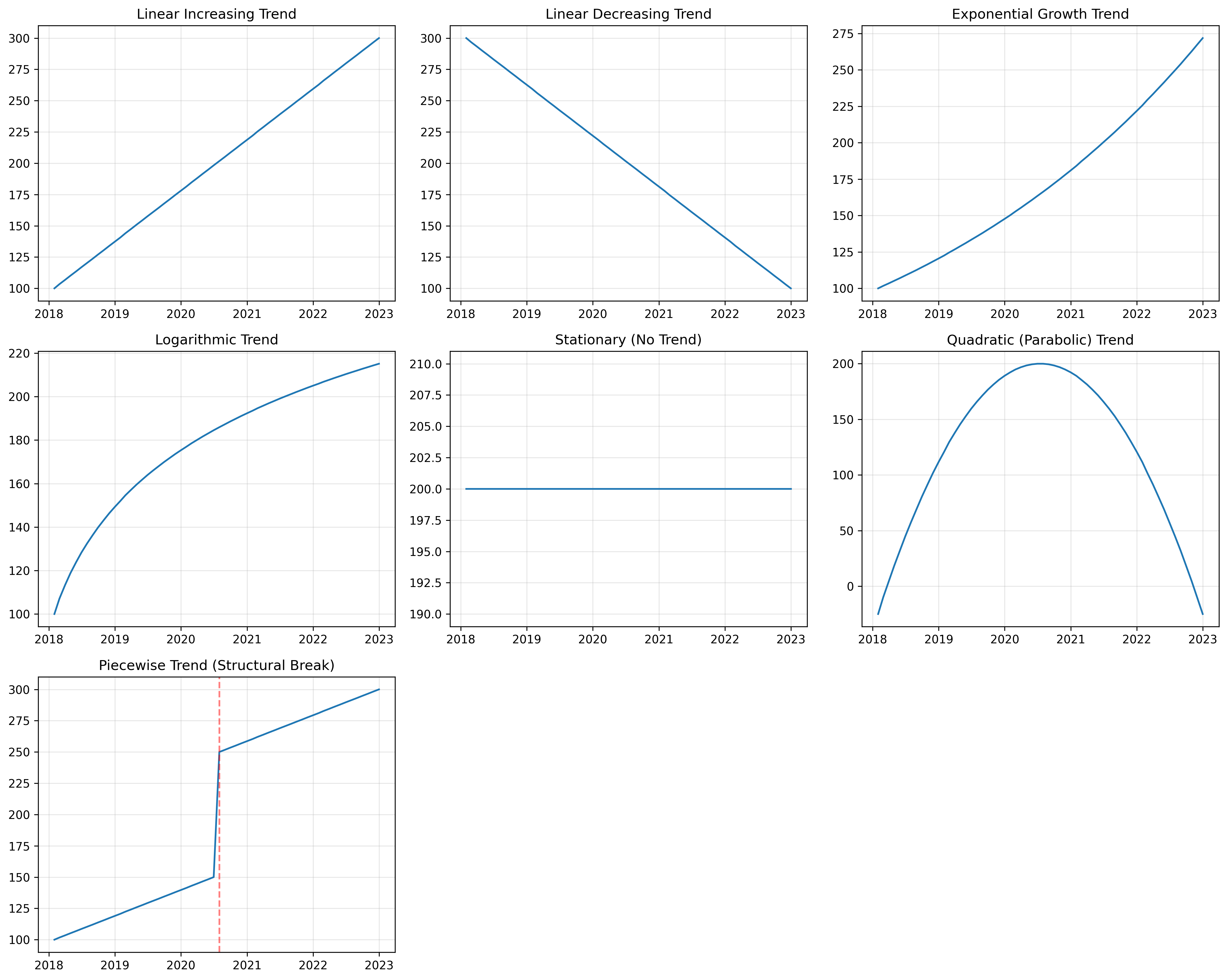 The trend represents the long-term progression of your series - whether values are generally increasing, decreasing, or remaining stable over time. As shown in Figure 2, trends can take many forms.