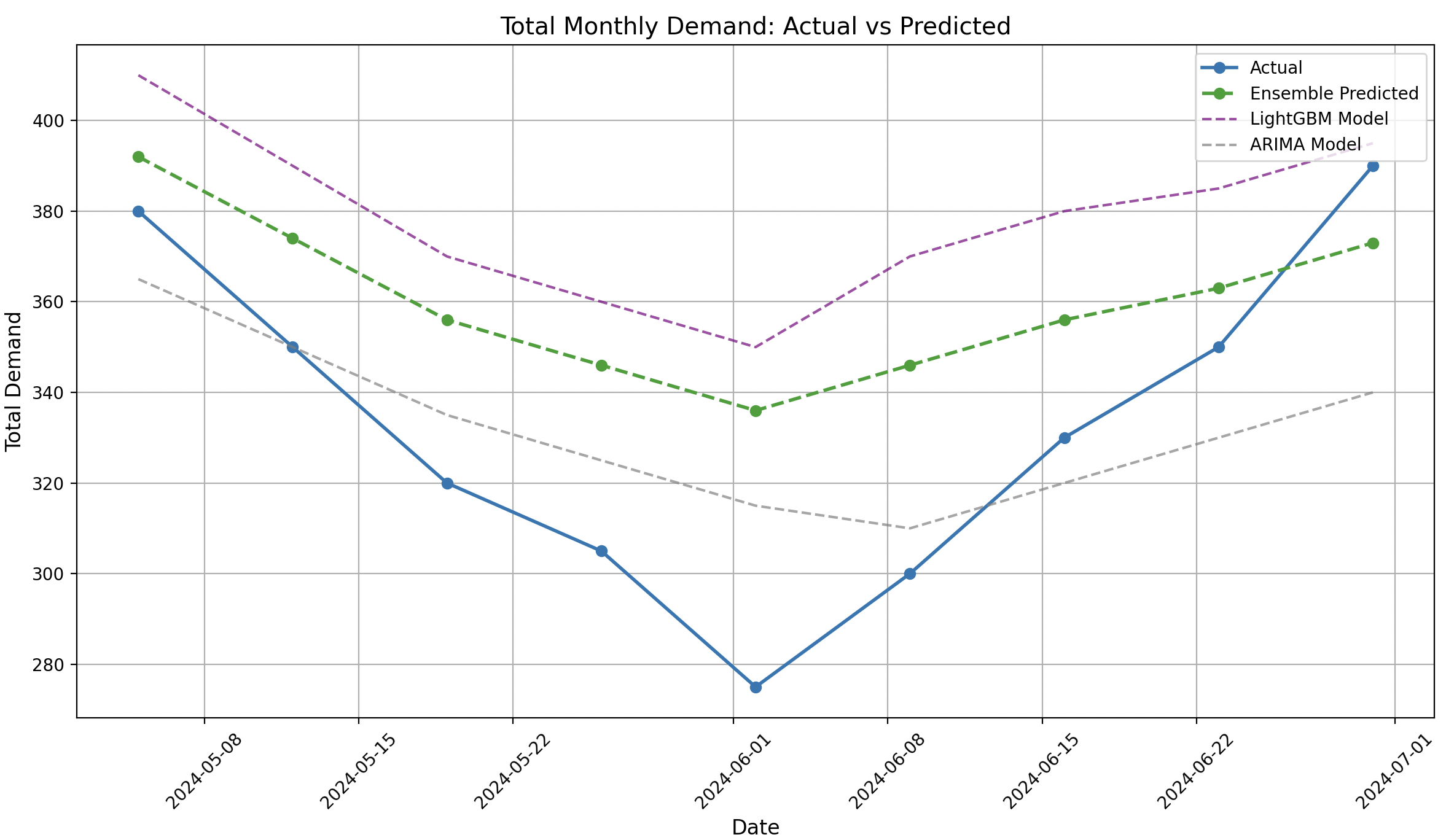 Different forecasting models capture different aspects of time series data. Statistical models like ARIMA excel at capturing autocorrelation patterns, while machine learning models like LightGBM often better capture complex non-linear relationships. By combining these complementary strengths, we can get the best of both models.